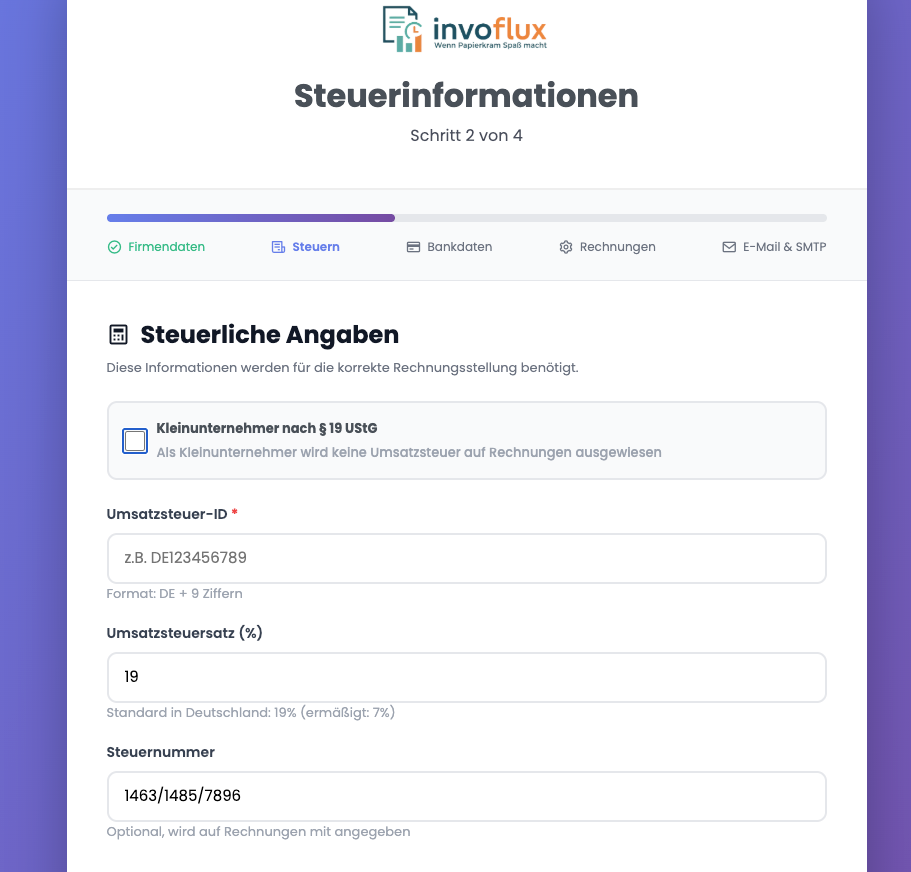Schritt 2: Steuerinformationen An dieser Stelle musst Du die entsprechende Auswahl treffen: Bist Du Kleinunternehmer nach §19 UStG oder klassisch Umsatzsteuerpflichtig. Entsprechend sind diese Felder zu befüllen. Tags Setup Veröffentlicht 05.02.2026 20:56