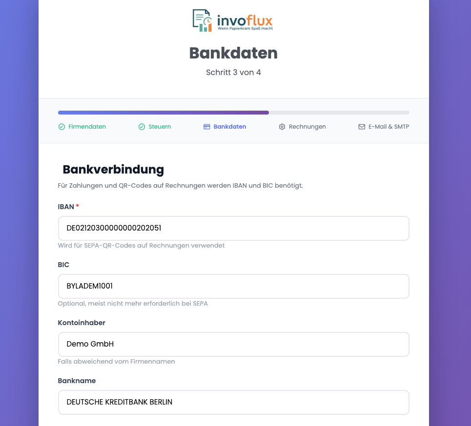 Schritt 3: Bankdaten Fast selbsterklärend, hier musst Du Deine Bankdaten hinterlegen, diese erscheinen auf jeder Rechnung oder im Angebot, Brief oder Lieferschein. Tags Setup Veröffentlicht 05.02.2026 20:50