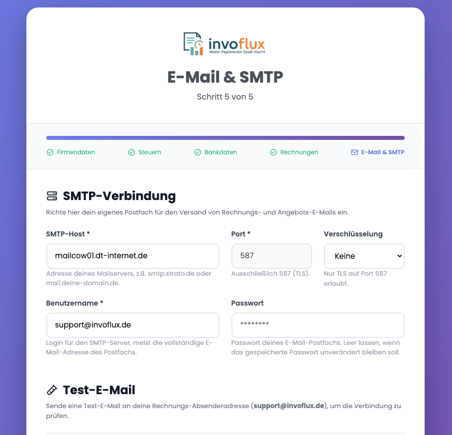 Ohne den Schritt kann InvoFlux keine E-Mails versenden! Aufgrund den neusten Spam-Richtlinien haben wir uns dazu entschlossen, dass InvoFlux ausschließlich von einem Deiner Postfächer Mails verschickt.