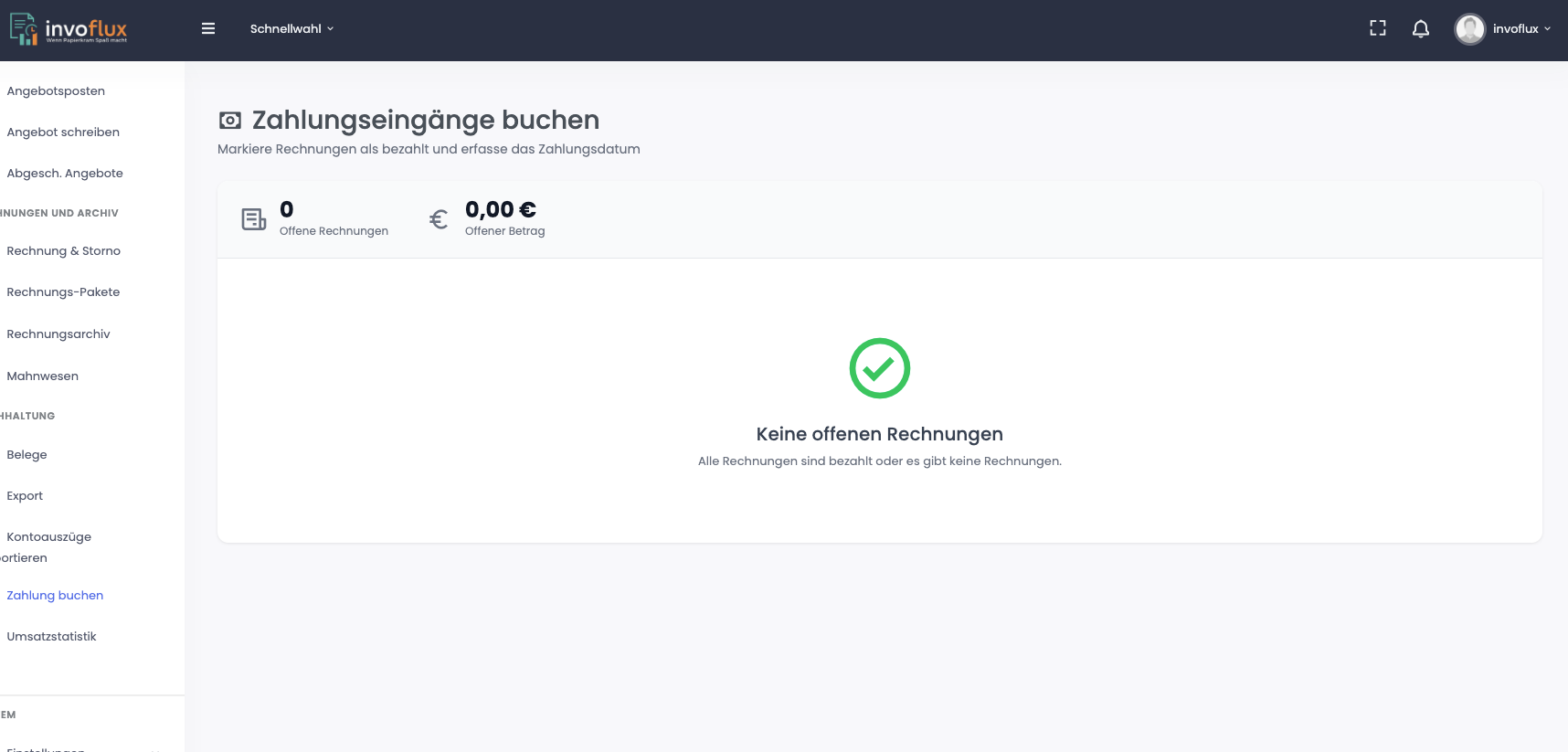 Je nach Tarif haben Sie den automatischen Zahlungsimport nicht und müssen die Zahlungen manuell verbuchen. Hierzu gibt es unter dem Menüpunkt "Schnellstart" den Link, als auch in der linken Navigation "Zahlung buchen". Hier im Dialog können Sie bei der entsprechenden Rechnung das Zahlungsdatum auswählen und auf "Verbuchen" klicken.
