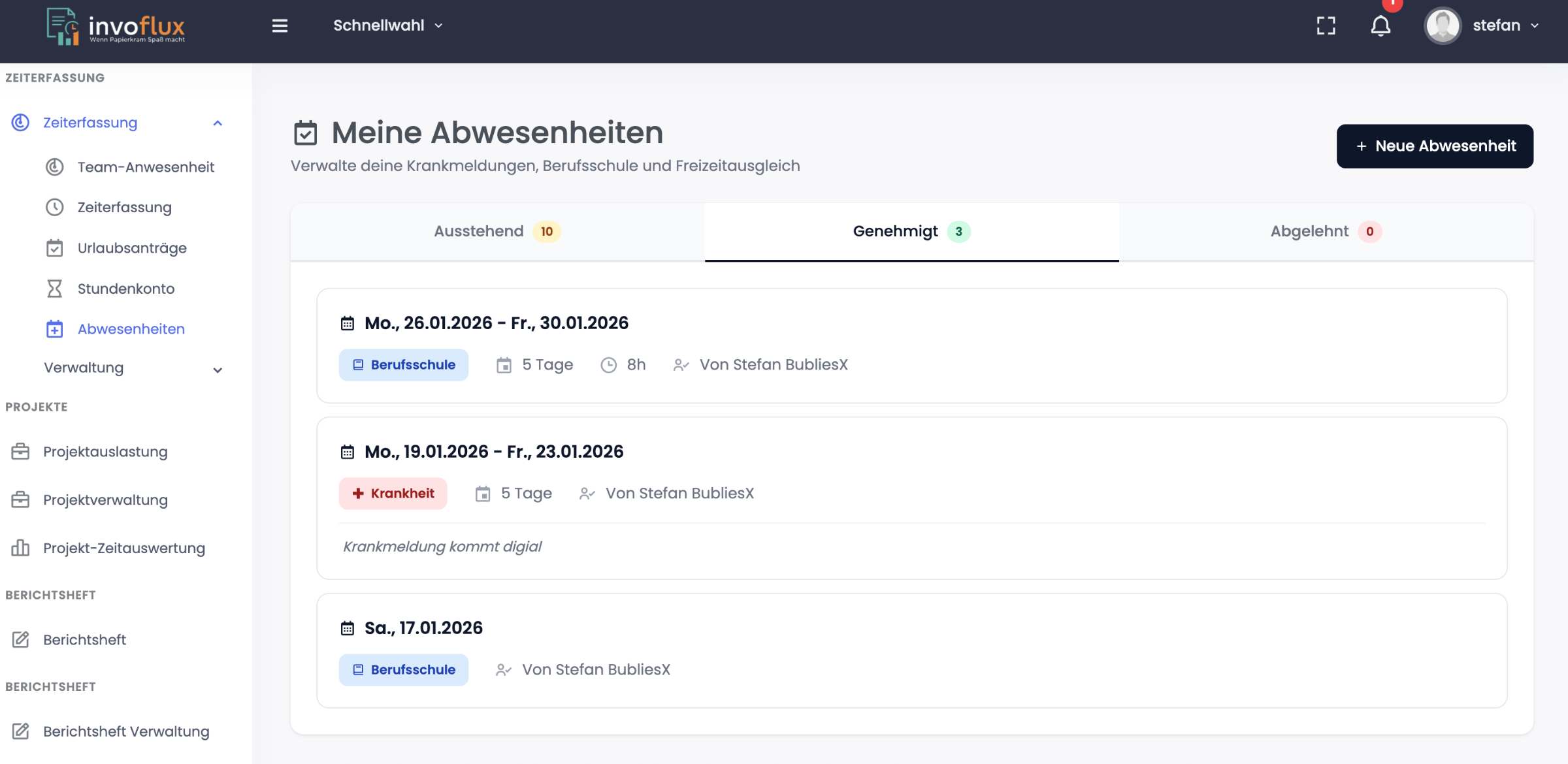 Abwesenheiten können durch den jeweiligen Benutzer jederzeit selbstständig eingestellt werden. Die Freigabe der Abwesenheitsbuchungen obliegt dem oder der Vorgesetzten.