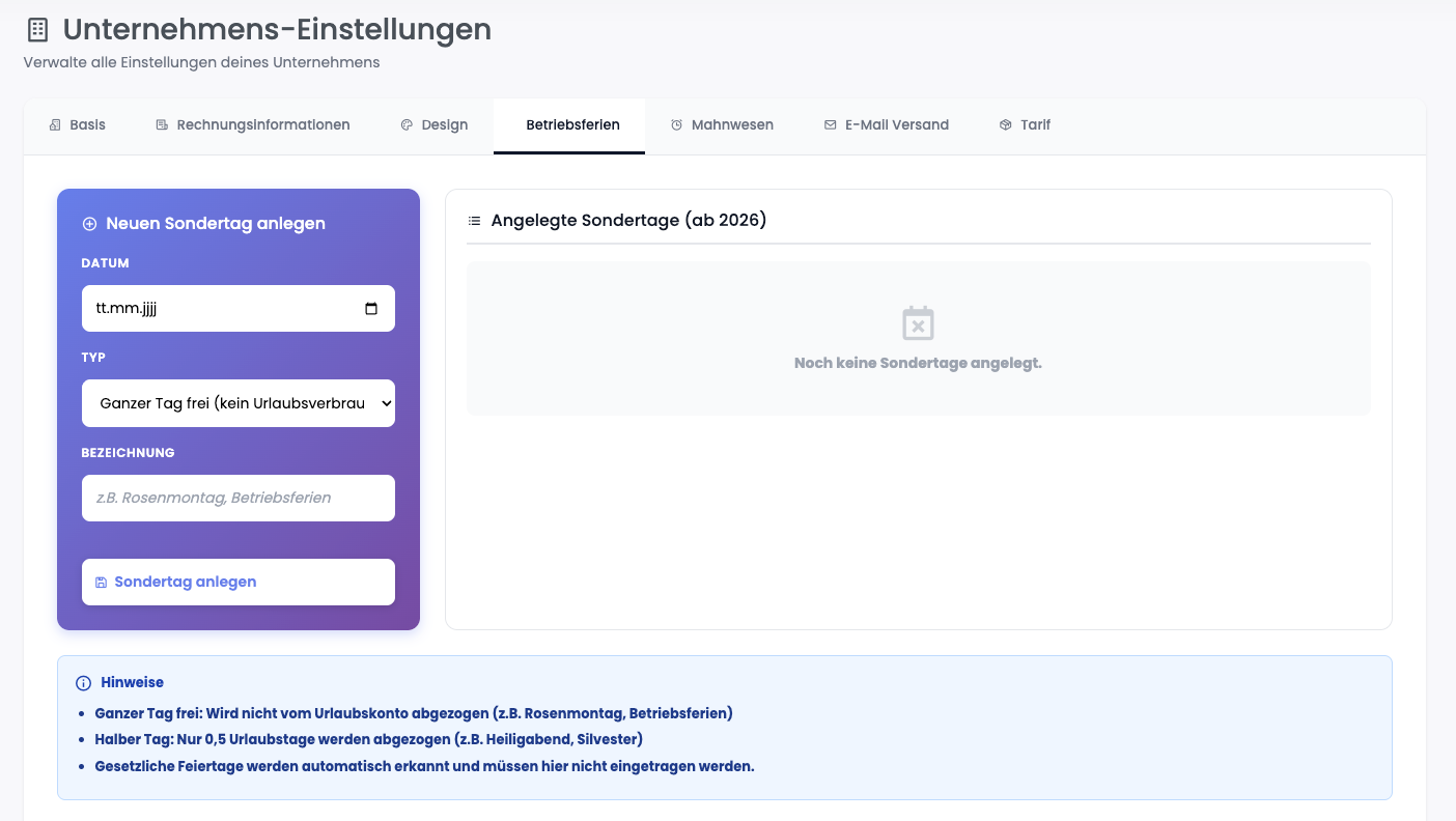 Unter Einstellungen -> Unternehmen und dann im Tab Betriebsferien könnt ihr die entsprechenden Firmenspezifischen Tage eintragen und entscheiden ob es ein halber oder ganzer Tag sein soll.