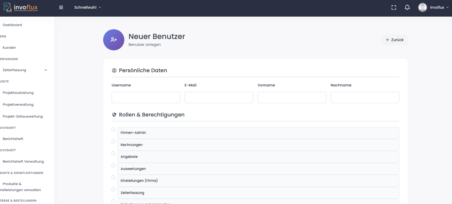 Im ersten Schritt legen Sie Ihre Mitarbeiter entsprechend an. Die Rechte sind für alle gleich in der Auswahl, egal welchen Tarif Sie haben. Nehmen wir mal an Sie haben den Tarif "Small", dann sehen Sie zwar hier auch "Projekte", können diesen Punkt aber nicht nutzen, denn er ist in Ihrem Tarif nicht enthalten.
