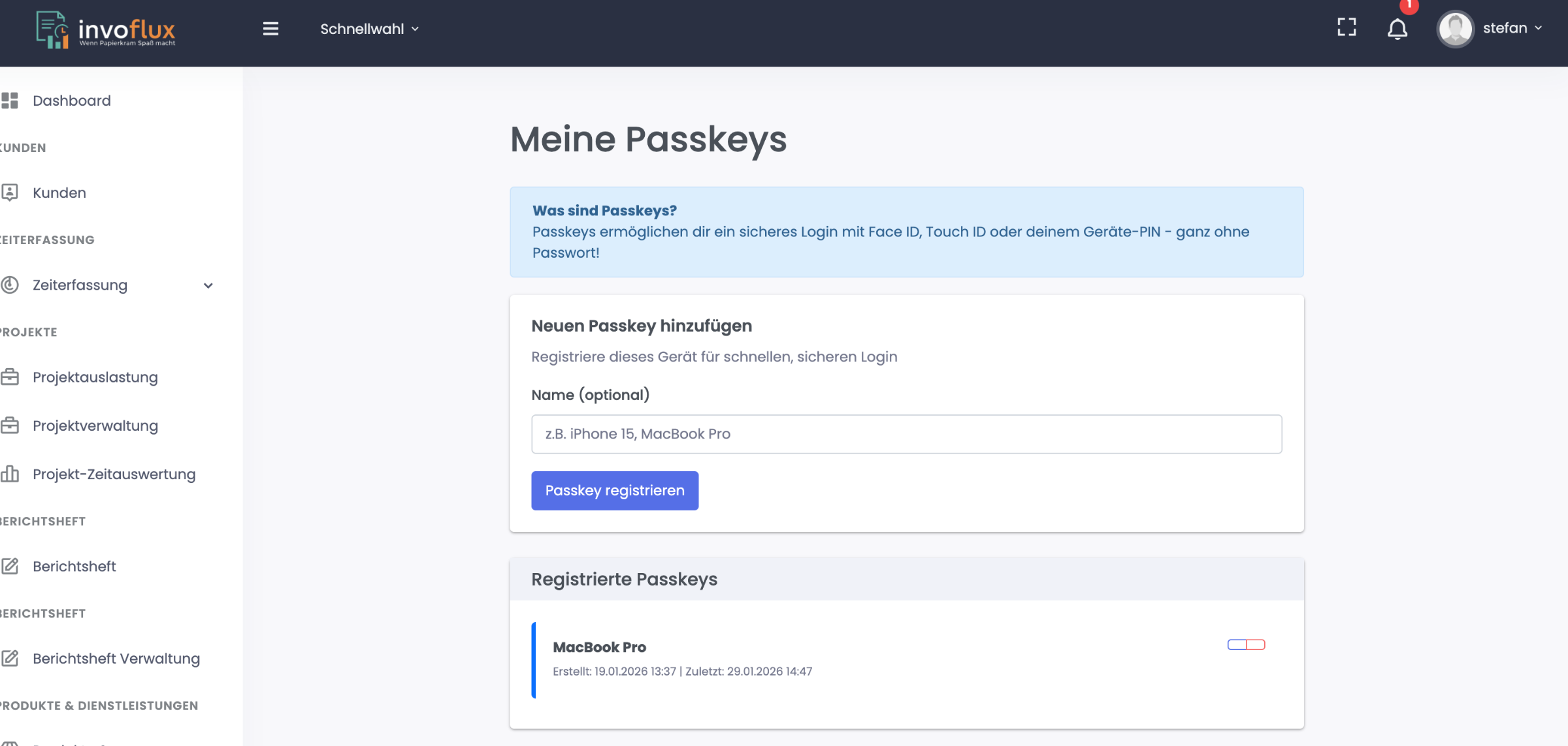 Biometrischer Login Oder anders genannt: Passkey. Du kannst mit Deinem Benutzer jederzeit s.g. Passkeys für verschiedene Geräte anlegen und Dich dann mit Fingerabdruck oder Gesichtserkennung einloggen. Tags passkey Veröffentlicht 05.02.2026 21:00