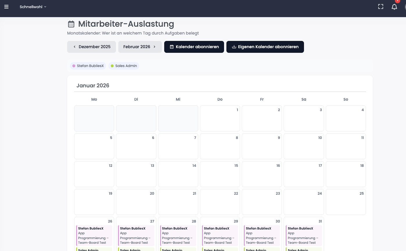 Projektauslastung Bei der Projektauslastung haben wir eine Kalender-Übersicht mit farbig hinterlegten Mitarbeitern. Damit kann man die Auslastung des jeweiligen Mitarbeiters gut einsehen. Der Kalender ist als einmaliger Download wie auch als Feed verfügbar. Tags projekte Veröffentlicht 05.02.2026 21:09