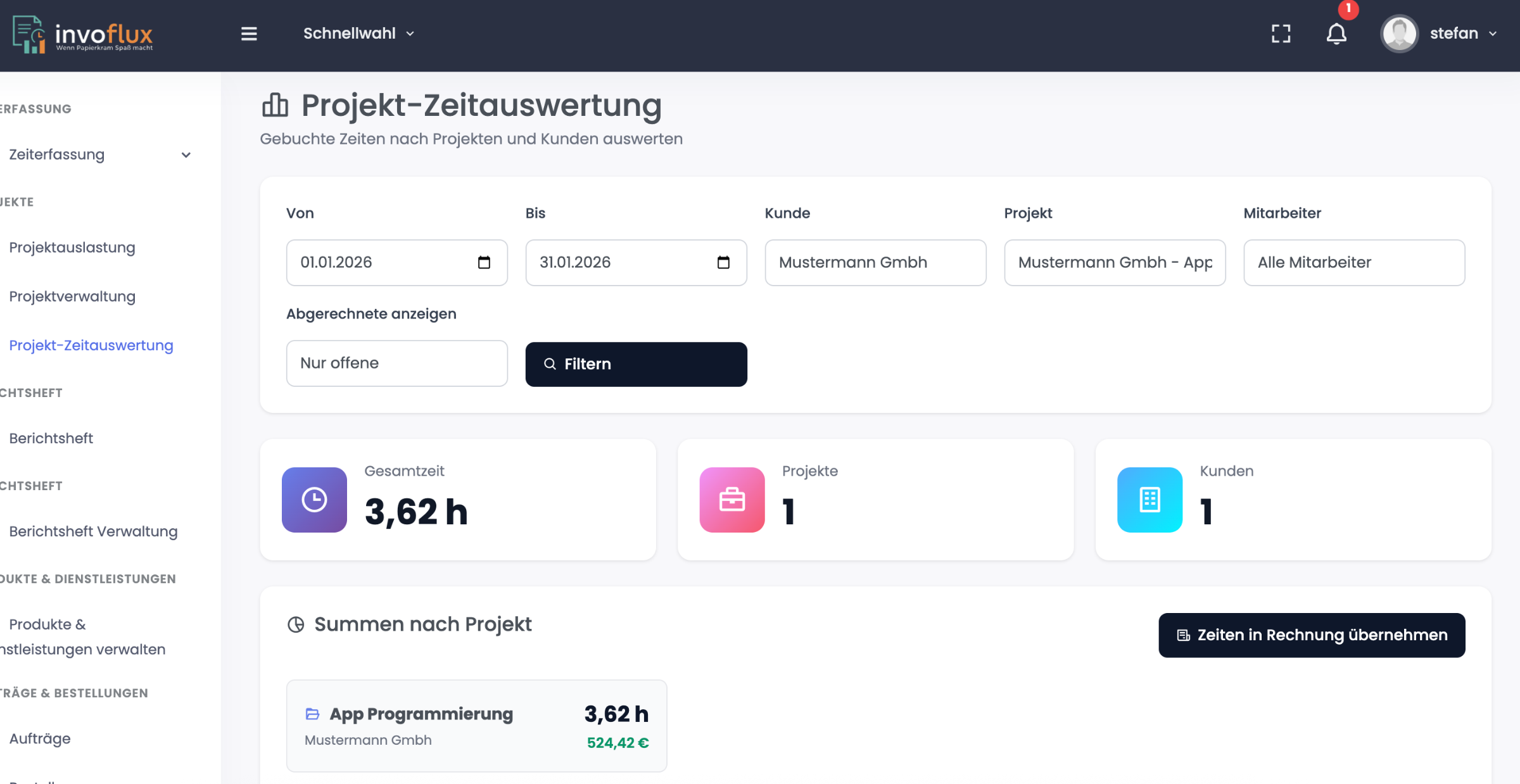 - Öffne den Bereich für Projekt-Zeitauswertungen in InvoFlux.